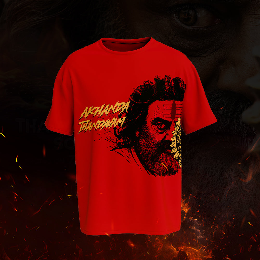 This vibrant red regular-fit T-shirt captures the raw power of the Akhanda universe. The front design features a striking portrait of the iconic Akhanda avatar with fierce detailing, paired with the dynamic text “Akhanda Thandavam” in bold typography - symbolizing unstoppable energy and devotion.