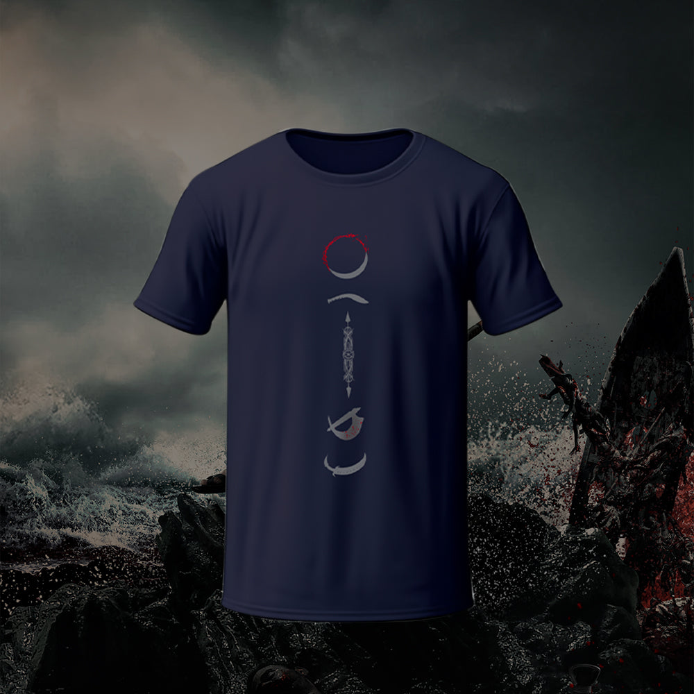 The front features a unique vertical arrangement of symbolic weapon graphics paired with a subtle red accent, representing dominance and authority. The back showcases the iconic Devara logo in a sharp, battle-inspired font, making this tee a perfect statement piece for true fans.