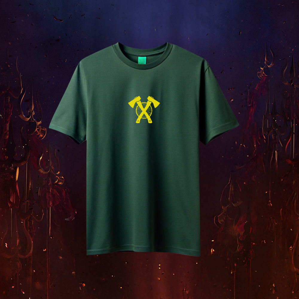 The front features a minimal yet striking yellow crossed axe emblem, symbolizing strength and dominance. The back showcases an intricate dragon-themed artwork framing the iconic Pushpa silhouette, representing fearlessness and grandeur. This tee is a true collector’s piece for fans who want to wear their fandom with pride.